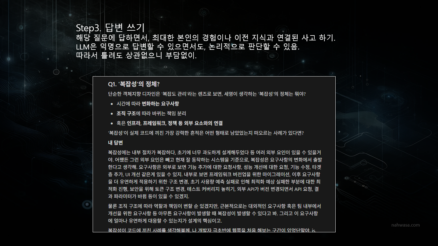 Step 3. LLM의 질문에 답하면서, 최대한 본인의 경험이나 이전 지식과 연결하여 사고해보세요.
