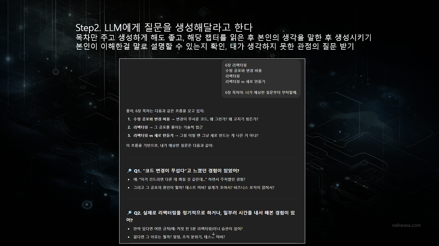 이 책은 제가 먼저 읽고 제 생각을 책에 나와 있는 질문 형태의 연습문제와 함께 LLM에게 줬습니다. 그리고 LLM에게 제 현재 지식에 알맞게 심화 질문을 주도록 하고, 제가 답변하고 토론을 이어갔습니다.