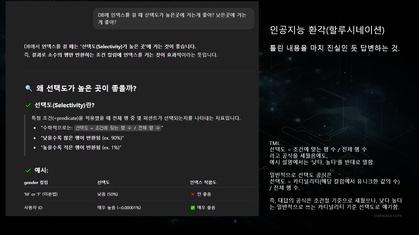 실제로 구글에서 'DB 선택도'로 검색해보시면 글들이 높다, 낮다 엄청 섞여있죠. 실제론 '선택도' 자체론 의미가 없고, 어떤 선택도를 기준으로 말하는건지 글을 보고 파악이 필요합니다. 자기계발 중에 책에 'DB 선택도'가 나와서 LLM에 검색했더니 저렇게 말했다면, 이후 많이 헷갈리겠죠.