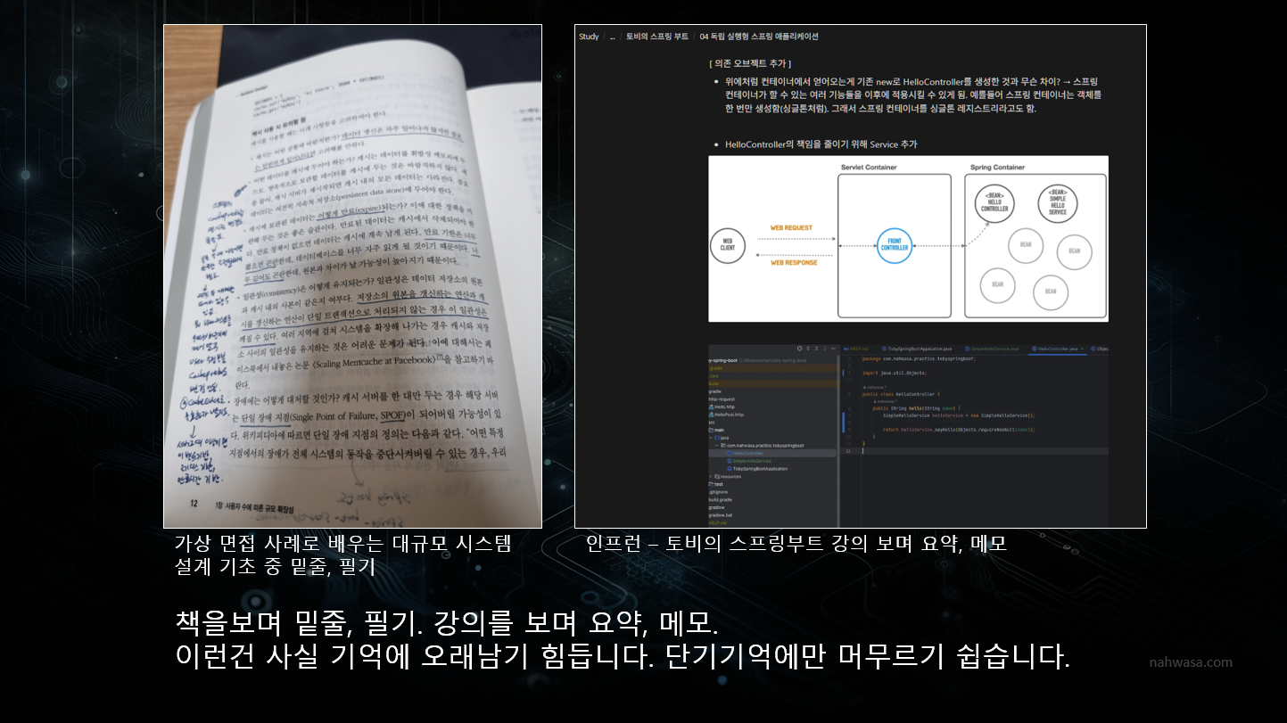 추가로 개인적으로는 대학교때부터 미래의 저와 대화하듯 구어체로 필기를 하는데, 이것도 효과가 좋은 것 같습니다.
