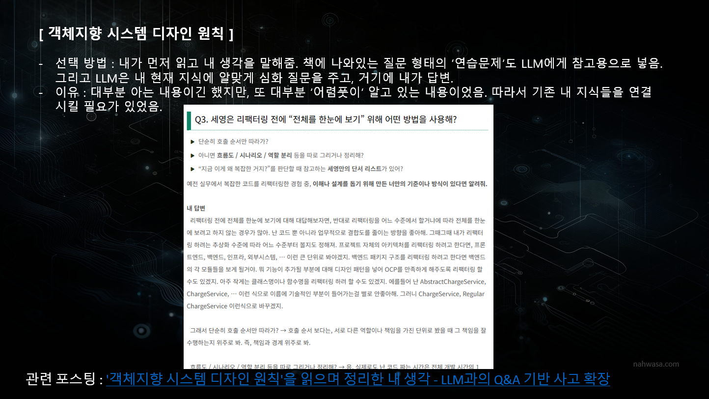 관련 글 : '객체지향 시스템 디자인 원칙'을 읽으며 정리한 내 생각 - LLM과의 Q&A 기반 사고 확장