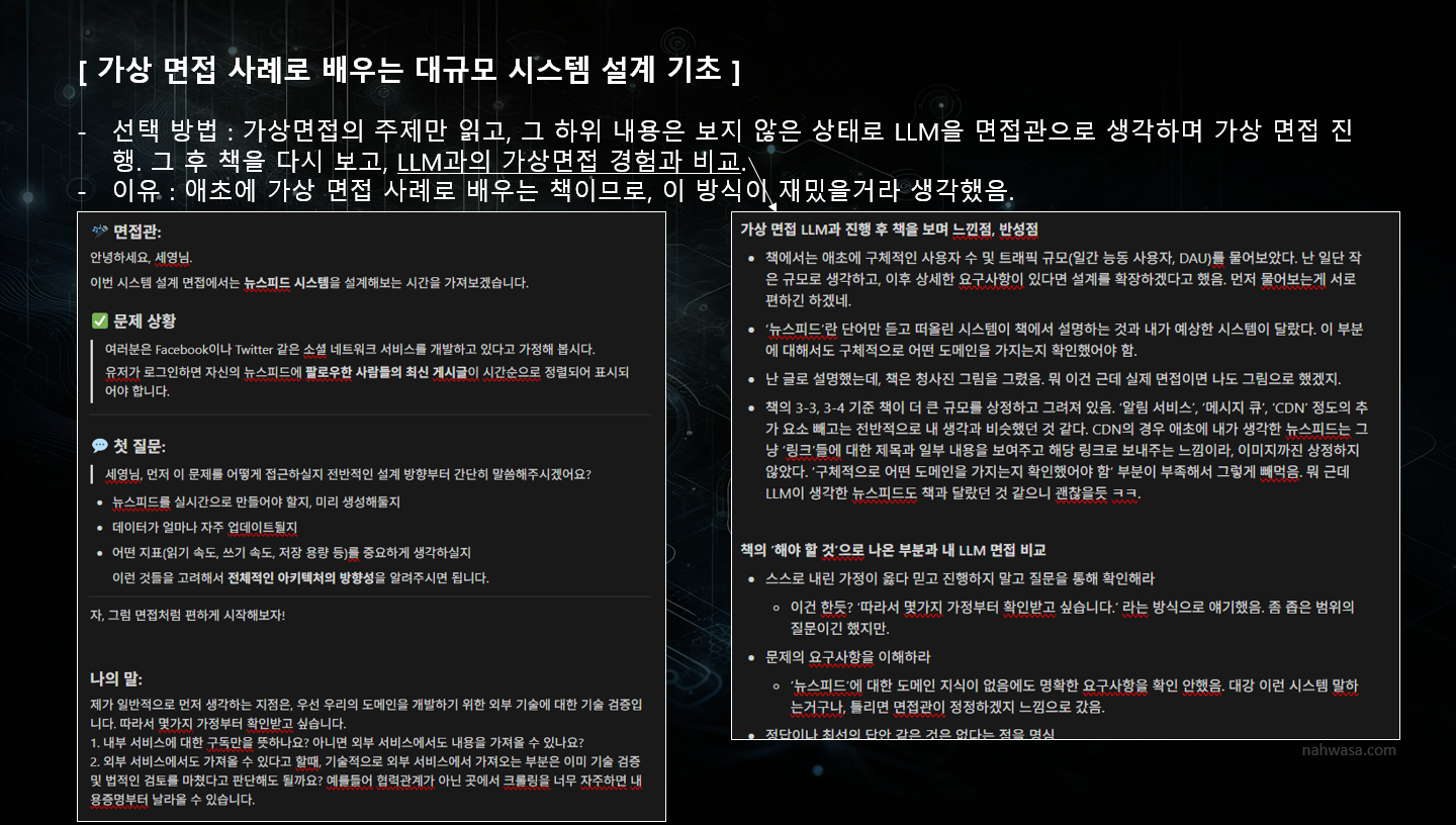 사실 이건 별다른 이유보다는, 그냥 책 제목이 '가상 면접 사례로 배우는' 이라서 이 방식이 재밌을 것 같았기 때문입니다.