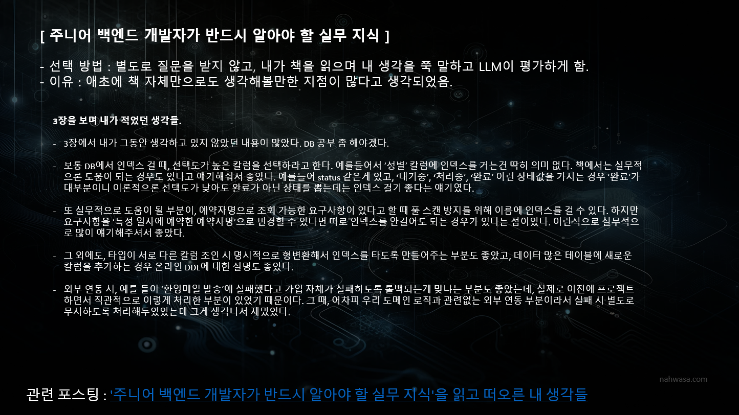 주니어 백엔드 개발자가 반드시 알아야 할 실무 지식 책은 별도로 질문을 받지 않고, 제가 책을 읽으며 제 생각을 쭉 말하고 LLM이 평가하도록 했습니다. 애초에 책 자체만으로도 생각해볼만한 지점이 많다고 생각했거든요. 참고로 이번년도 5월쯤 나온 책인데, 상당히 좋습니다. 추천드립니다.