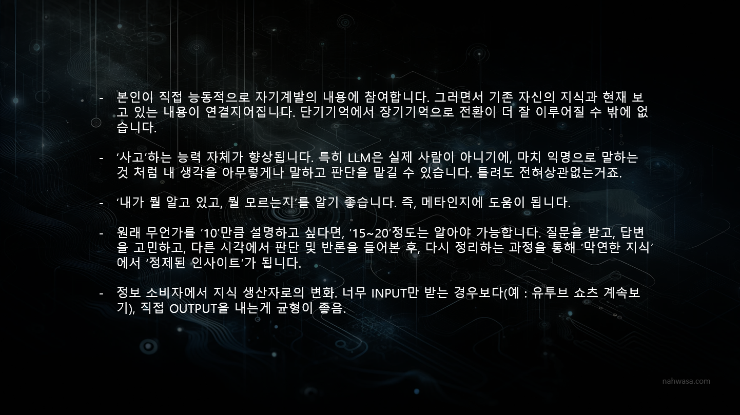 반면에 정답이 없는 '내 생각'을 LLM이 판단하게 한 후, 틀린점이나 보완할점을 듣는다면, 범위가 확연히 줄어들게 됩니다. 또한 LLM의 말의 진위여부와 상관없이 기본적으로 내 사고는 향상되었고, 스스로 사고했기에 장기기억으로 전환될 확률을 높힐 수 있죠.