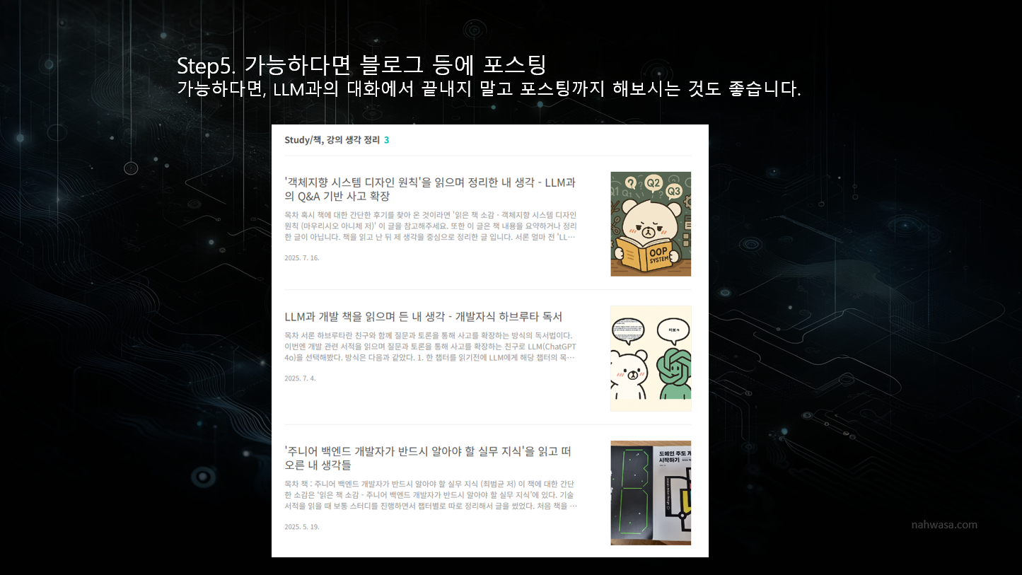 이제 제 최근 2개월 가량의 활용예시를 보여드리겠습니다. 위 Step 방식에서 책과 제 현재 지식에 따라 조금씩 방법을 바꿔가며 LLM을 활용한걸 보실 수 있으실꺼에요.