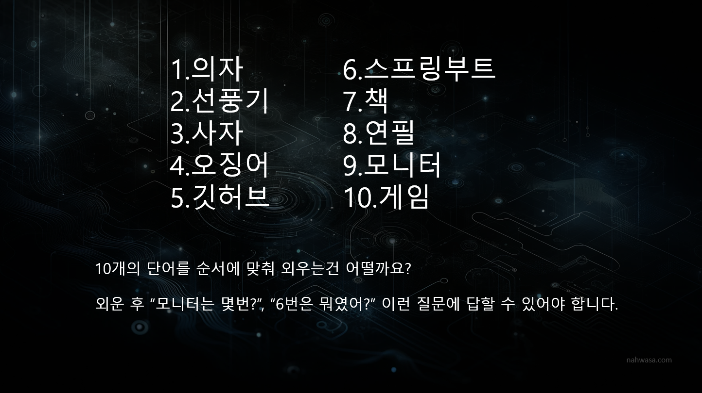 10개의 단어를 순서와, 단어 모두 외우는건 어떨까요?