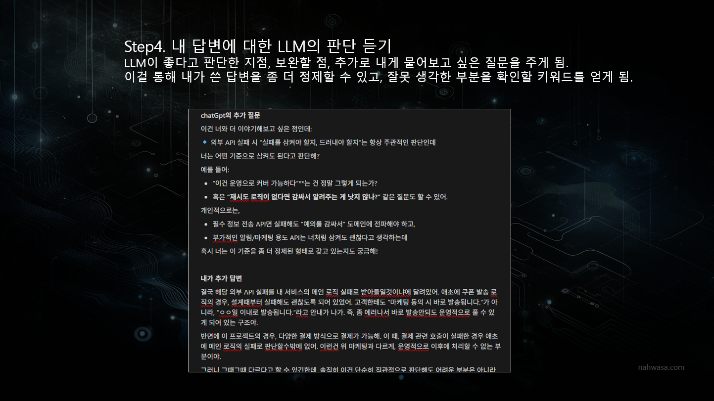 LLM은 보통 좋다고 판단한 지점, 보완할 점, 추가로 내게 물어보고 싶은 질문을 주게 됩니다.