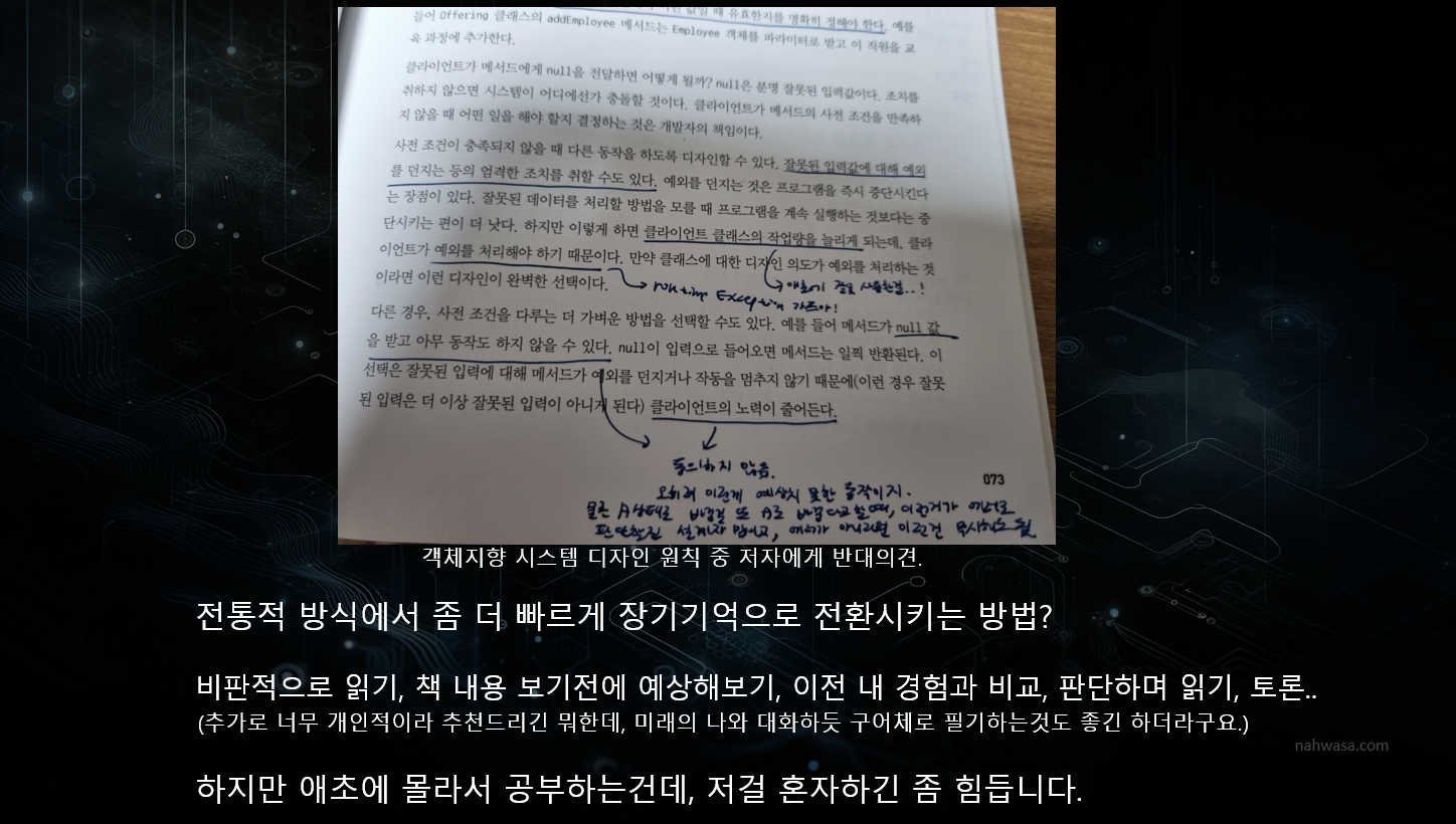 그렇게 한 이유는 대부분 아는 내용이긴 했으나, 다양한 객체지향 개념들이 섞여서 나오는 책이다보니 '어렴풋이'알고 있는 부분에 대해 정리하고 싶었기 때문입니다. 즉, 기존 제 지식들을 연결시킬 필요가 있었기 때문입니다. 참고로 관련글은 5만자 정도의 분량입니다. 자기전에 수면제 대용으로 쓰시면 좋습니다.