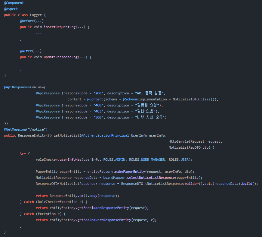 - 로그 부분은 AOP로 빼줬다. (책 내용과는 관계없다.)
