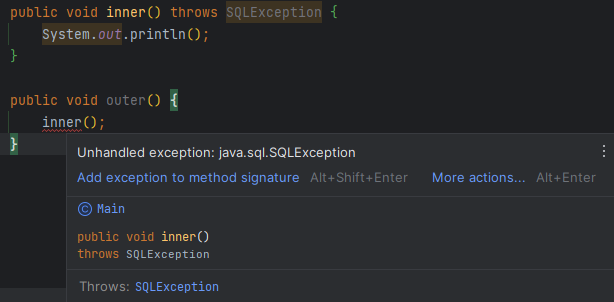 - ☆ e.g. checked exception인 SQLException은 별도로 처리안하면 에러가 뜬다. unchecked exception은 안뜬다.