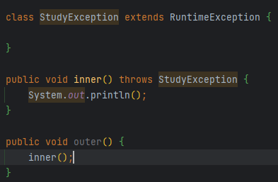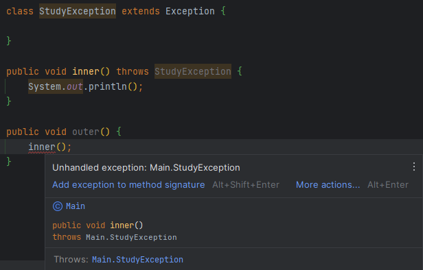 - ☆ checked와 unchecked를 각각 상속해서 만든 경우에도 동일하게 작동한다. (참고로 이하의 코드에서 RuntimeException을 상속한 경우의 코드에서는 throws 부분도 뺴도 상관없다.)
