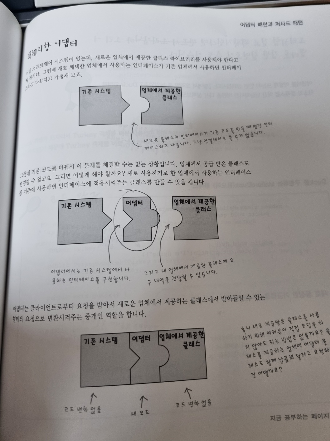 - ☆ 이하 해드퍼스트 디자인 패턴책의 캡쳐이다. 어댑터 패턴을 어떻게 사용하는지 확인할 수 있다.