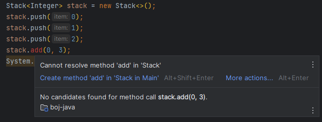 e.g. 자바의 Stack은 일반적으로 잘못된 코드로 알려져있다. 스택이라는 자료구조는 원래 한쪽 방향으로 넣고, 한쪽방향으로 뺄 수 있어야 한다. 즉 LIFO (마지막에 들어간게 먼저 나온다)가 지켜져야 한다. 하지만 자바의 Stack은 코드 재사용을 위해 Vector를 상속했고, 이에 따라 문제가 발생한다. 이하의 경우 마지막에 들어간 '3'이 pop으로 나오길 원하지만, add은 Vector의 함수를 사용한 것으로 스택 자료구조의 기본 조건을 충족하지 못하고 2가 출력되어 버린다.