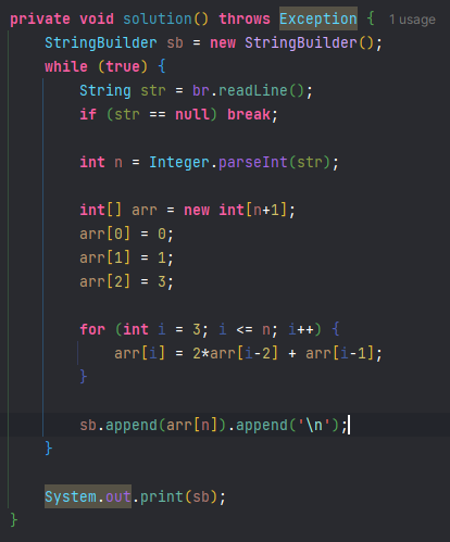 별 생각없이 자바로 풀고보니 출력이 어마무시한 수였다.. ㅋㅋㅋㅋ DP를 BigInteger로 푸는 맛없는 짓은 하기 싫었으니 파이썬으로 갈아탔다. 이하 자바로 풀었다가 출력보고 버린 코드 이다.