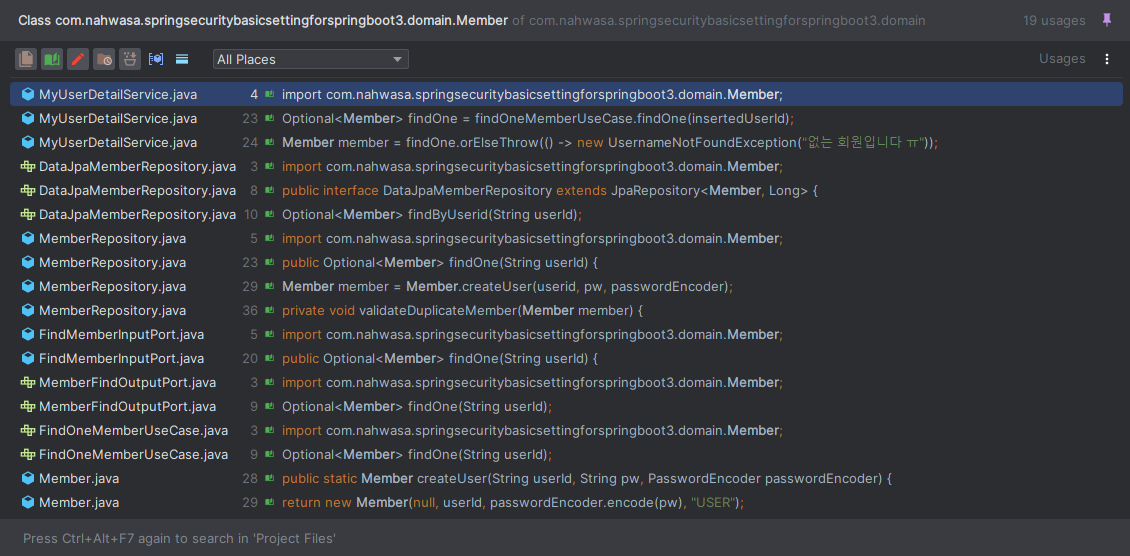 도메인의 Usages를 보면 출력 어댑터에서만 사용된 것을 확인 가능하다.