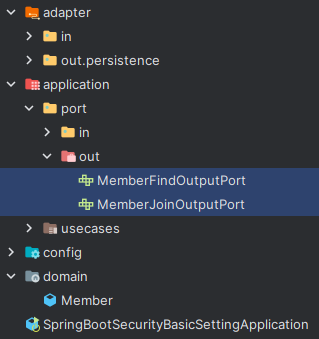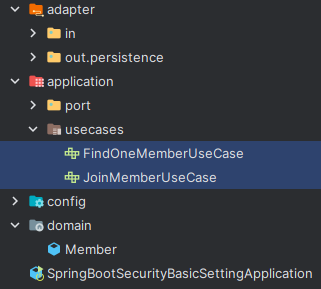 입력 포트를 통해 사용될 유스케이스이다. 우선 한 명의 멤버를 찾는 유즈케이스와, 멤버 회원가입 유즈케이스를 두었다. 입력 어댑터에서 유스케이스나 입력 포트를 통해 도메인을 넣어주는건 말이 안되는 것 같아서 도메인을 리턴은 해주더라도 입력은 dto 등 다른 방법이 좋을 거라 생각했다. 내 경우엔 필요한 정보가 적어 일단 인자로 그냥 받았다.