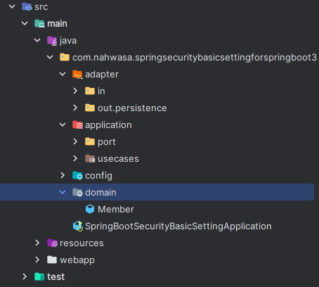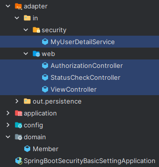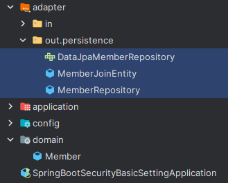 (config는 스프링 시큐리티 등의 세팅인데 헥사고날 구조에서 별도로 들어갈 만한 곳은 없는 것 같아서 그냥 별도 패키지로 두었다.)