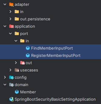 입력 포트를 통해 사용될 유스케이스이다. 우선 한 명의 멤버를 찾는 유즈케이스와, 멤버 회원가입 유즈케이스를 두었다. 입력 어댑터에서 유스케이스나 입력 포트를 통해 도메인을 넣어주는건 말이 안되는 것 같아서 도메인을 리턴은 해주더라도 입력은 dto 등 다른 방법이 좋을 거라 생각했다. 내 경우엔 필요한 정보가 적어 일단 인자로 그냥 받았다.
