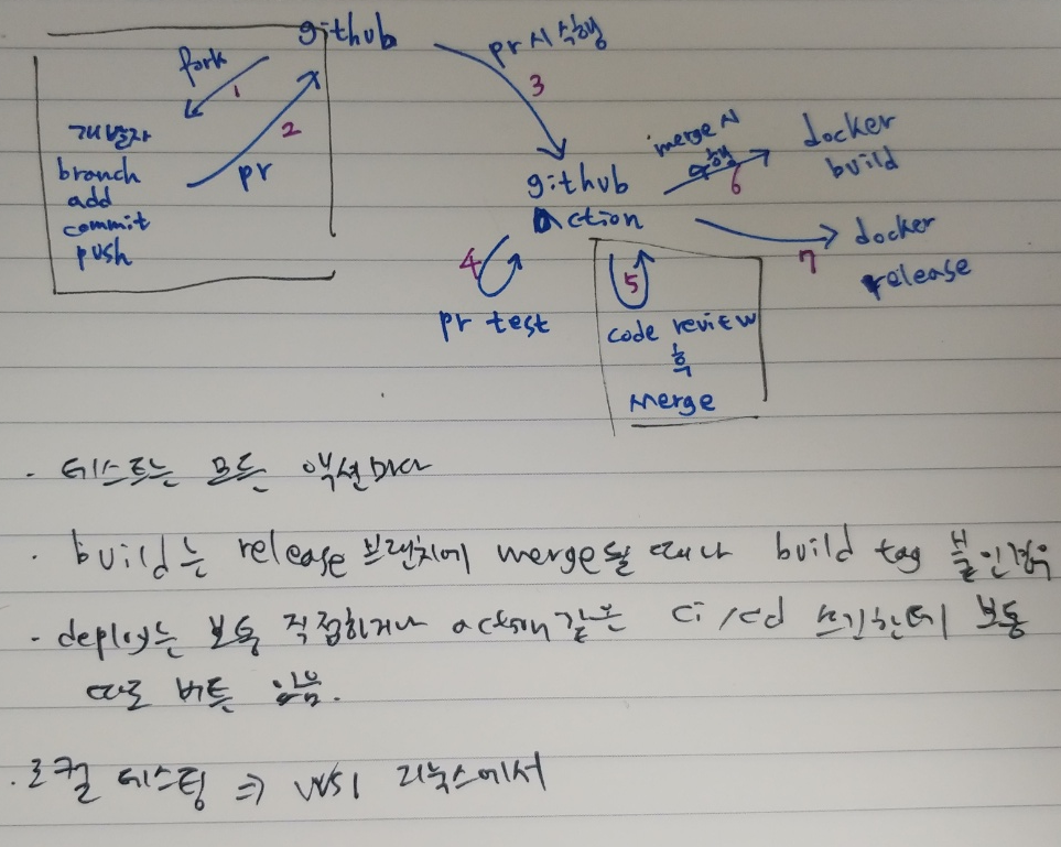 -> '0. [계획]'을 작성할 때는 개념이 없어 CI/CD 중 CD 부분만 생각했다면, '1. [계획수정]'에선 CI 개념도 넣어 일반적으로 devOps라 불리는 행위도 체험해 볼 예정이다. 좀 더 구체적으로는 pr 시 action을 통해 자동으로 개발자가 작성한 유닛 테스트를 돌리고, 배포할 수 있도록(배포는 경험해보고 좋다고 생각하는 방식에 따라 반자동으로 진행할 듯 하다. 머지 후 배포를 진행하도록 한다던지 하는식으로) 해보려 한다.