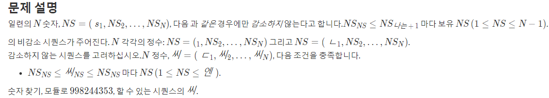 D : DP같이 생겨서 일단 공책에 그려보다보니 DP로 충분히 가능해보여서 그렇게 진행함. dp[x][y]를 n이 y일 때, 수열의 마지막 수가 x일 때 가능한 갯수로 정의함.