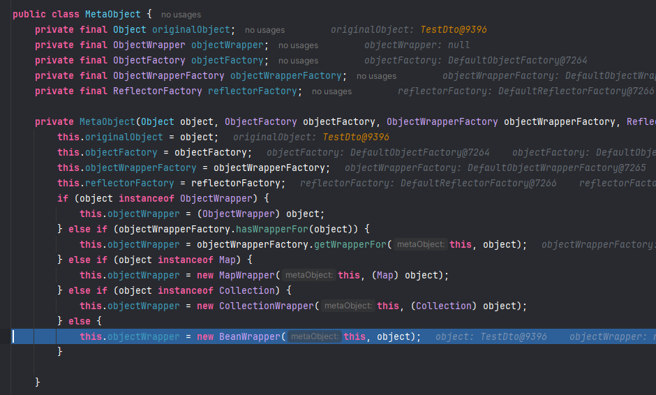 더 들어가다보면 MetaObject 생성자 부분이 있고, 여기서 MapWrapper, BeanWrapper에 따라 우리가 찾는 동작이 갈리게 된다.