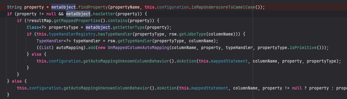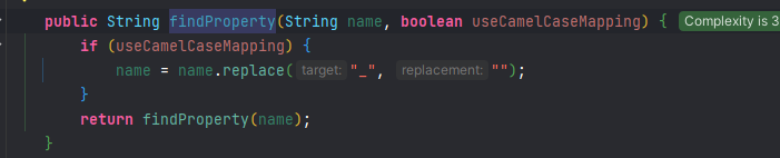 여기서 findProperty 함수를 부르게 되는데 이 때 처음에 설명한 configuration.isMapUnderscoreToCamelCase 설정이 인자로 들어간다.