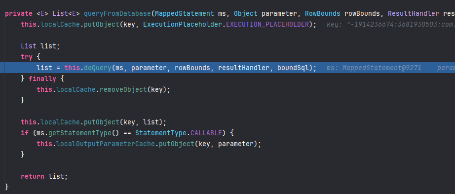 더 들어가보면 BaseExecutor.query() 에서 queryFromDatabase가 불린다.