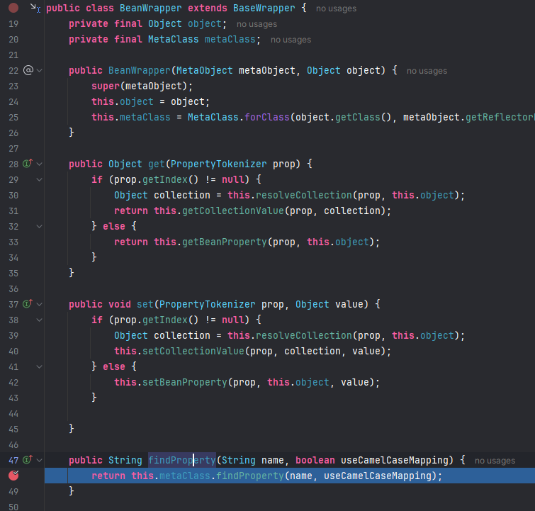 여기서 findProperty 함수를 부르게 되는데 이 때 처음에 설명한 configuration.isMapUnderscoreToCamelCase 설정이 인자로 들어간다.