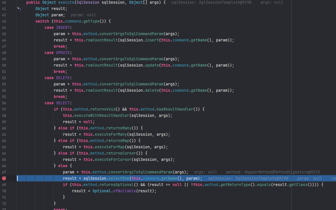 우선 MapperProxy<T>.invoke() 로 시작된다. 그리고 쭉쭉 들어가다보면 execute로 쿼리마다 분기쳐서 실행되는 부분이 있다. (MapperMethod.execute())