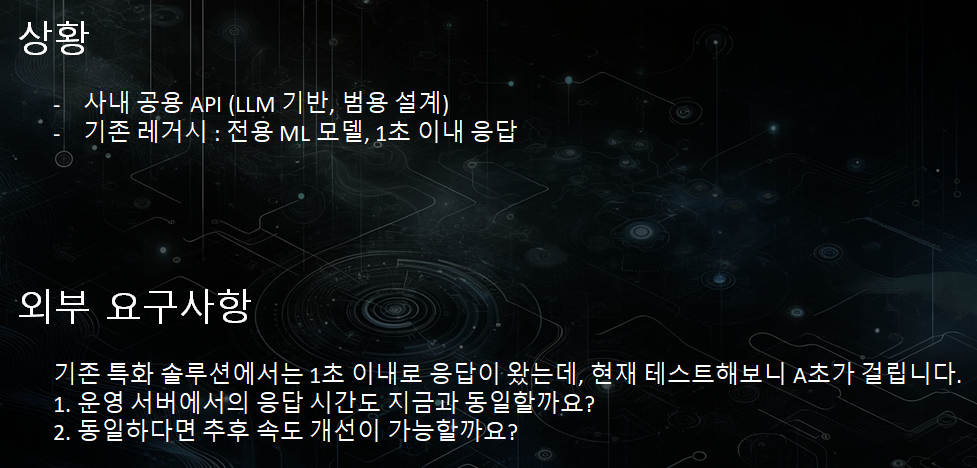 즉, 영업 쪽에서는 해당 ML의 대체품으로써 외부 업체에 얘기한거죠. 이에 따라 외부 업체에서는 속도 관련 이슈를 제시했습니다.