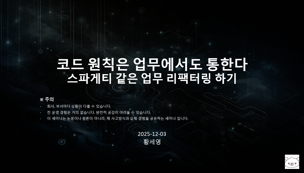 이번 세미나에서는 업무 의사결정, 협업, 일정 관리, 커뮤니케이션과 같은 업무에서 이 원칙들을 어떻게 활용할 수 있는지, 제 사례와 함께 생각을 공유드리겠습니다.