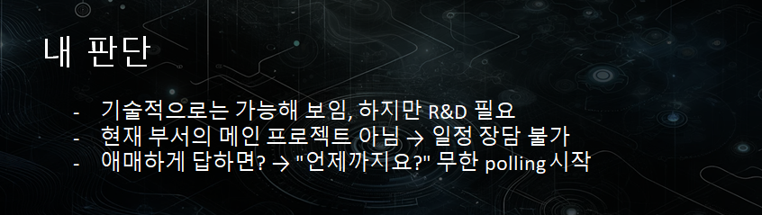 이 과정을 미루면 “그럼 언제까지 검토해주실꺼에요?”, “그럼 우선 PoC까지만 해주실 수 있나요?” 이런 가지들이 생겨날 수 있습니다. 불확실한 기능 요청은 초기에 명확하게 처리해야 뒤에 나올 브랜치 전체가 날아갑니다.