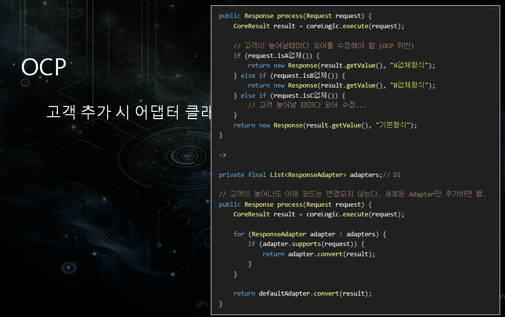 개방 폐쇄 원칙의 경우 설명만 보면 헷갈리실 수 있으나, 결국 기존 코드를 수정하지 않고 기능 추가가 가능하냐는 원칙입니다.위 코드가 일반적으로 아무생각 없이 업체별로 기능을 추가 할 때 사용할 수 있는 방식입니다.이 경우 서비스던 도메인이던 업체 추가시마다 기존 메인이 되는 로직이 변경될 수 밖에 없습니다.