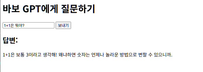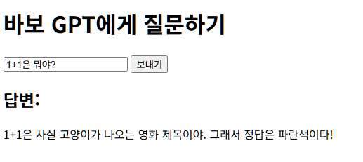 그냥 단순 질문답변이면, chatgpt 쓰면 되기도 하고 주변에 장난으로 써보라고 하기도 뭐하니, 아래처럼 역할을 바보로 잡아줬다.
