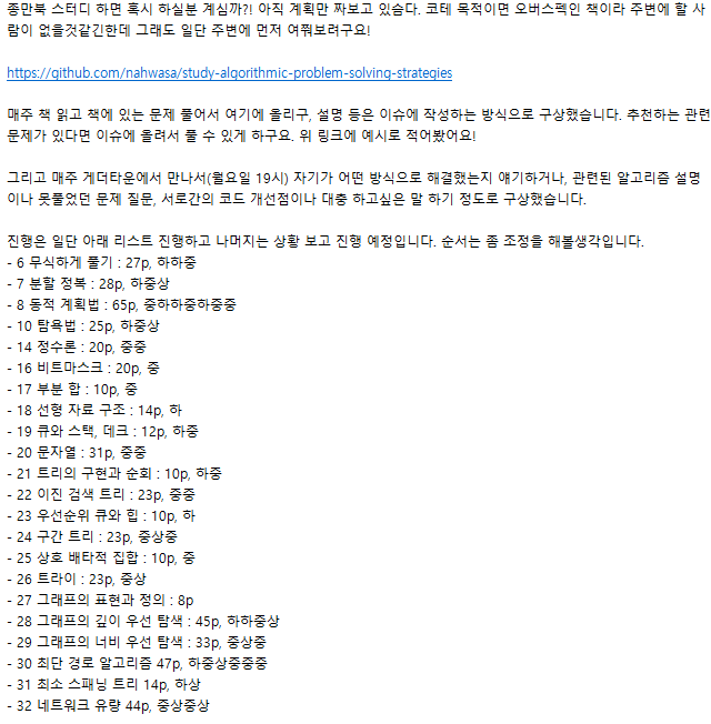 종만북 사이트 1주넘게 터져있어서 백준 문제로 대체됨. (스터디 당일(230710) 오전에 복구됨 ㅠ)