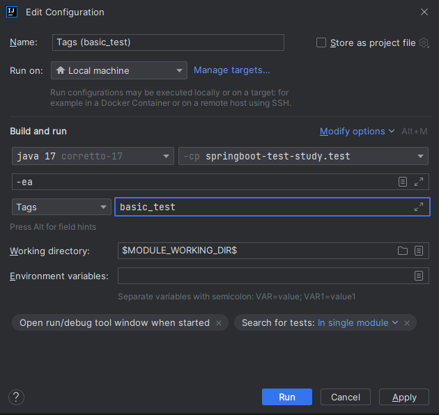 - JUnit으로 실행 시엔 아래와 같이 태그 지정 가능