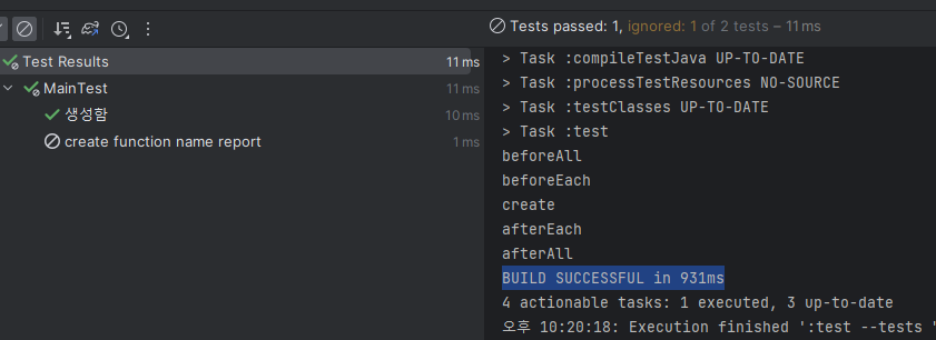 - 큰 차이는 없는데, Gradle로 실행 시엔 BUILD SUCCESSFUL 같은 그래들 메시지가 붙긴한다. 다만 그래들에서 설정할 수 있는 부분들이 있고, IDE 뿐 아니라 서버 환경에서도 동일하게 쓸 수 있으므로 그래들 쓸꺼면 그래들로 테스트하는게 나아보인다.
