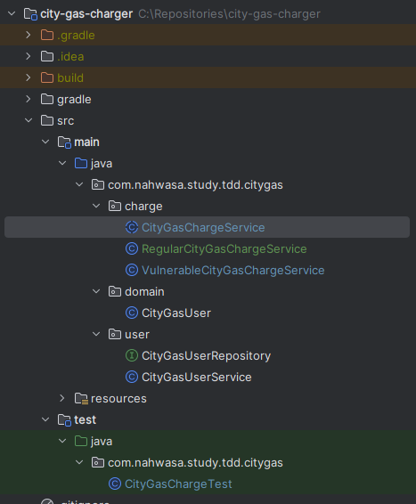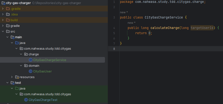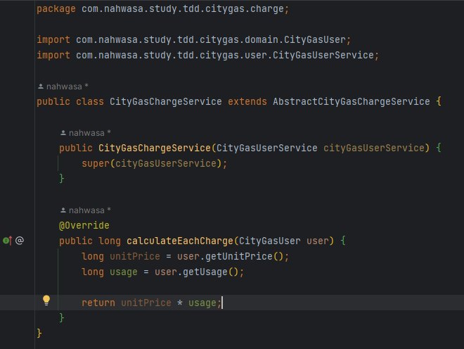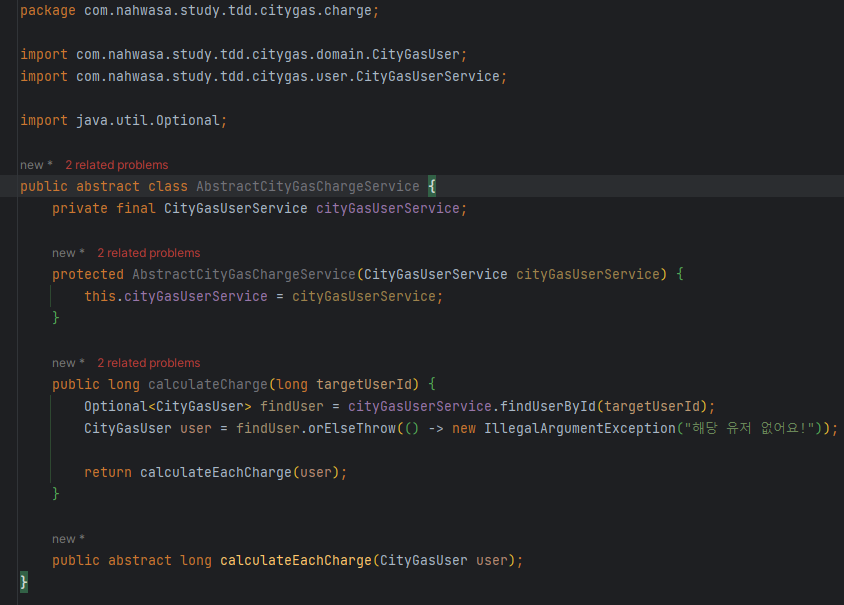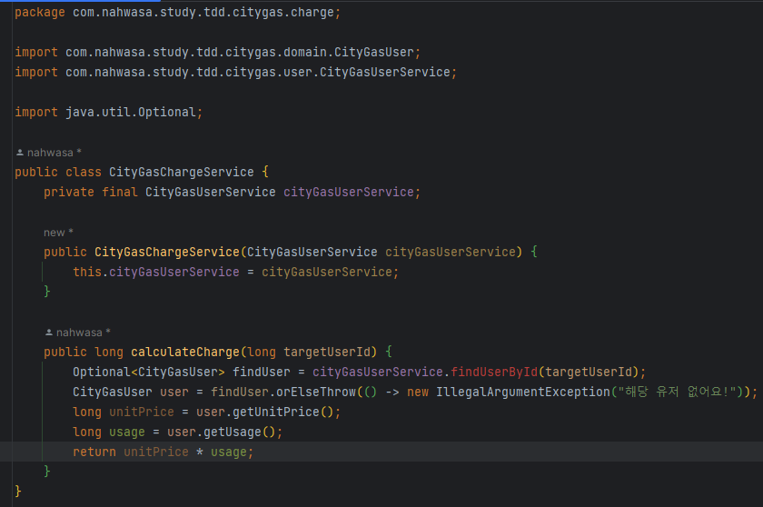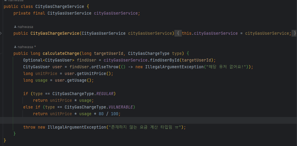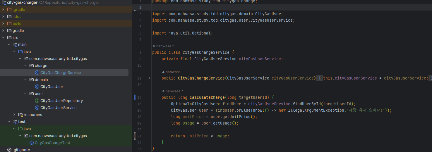 calculateCharge와 CityGasUser의 구현은 아래처럼 해줬다. 아직 CityGasUserService는 정의하지 않았다.