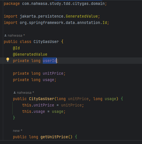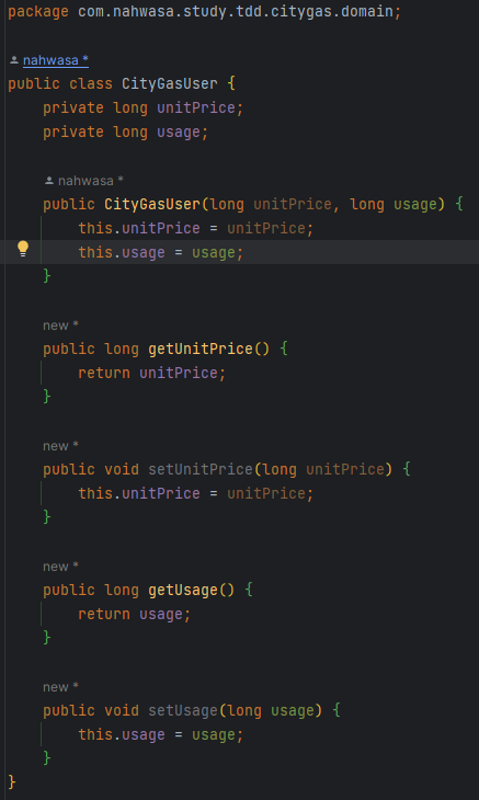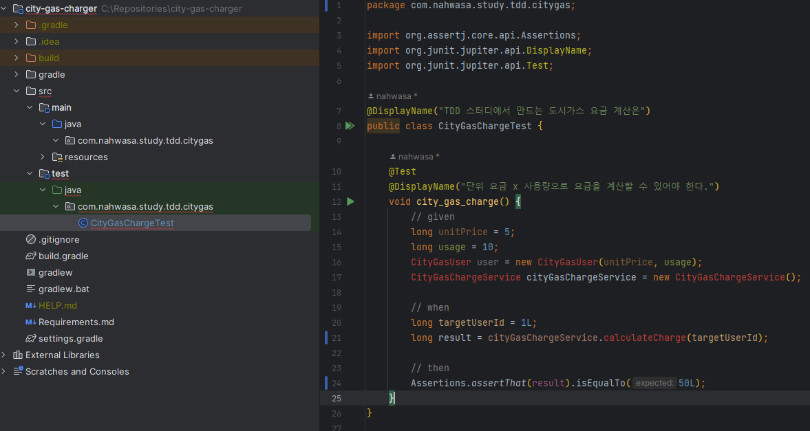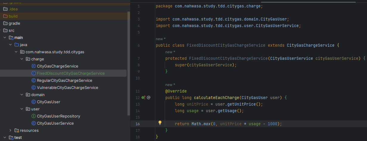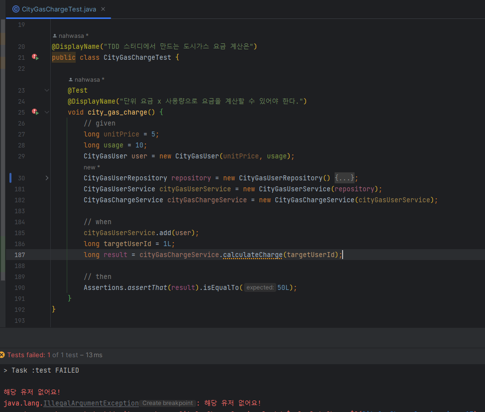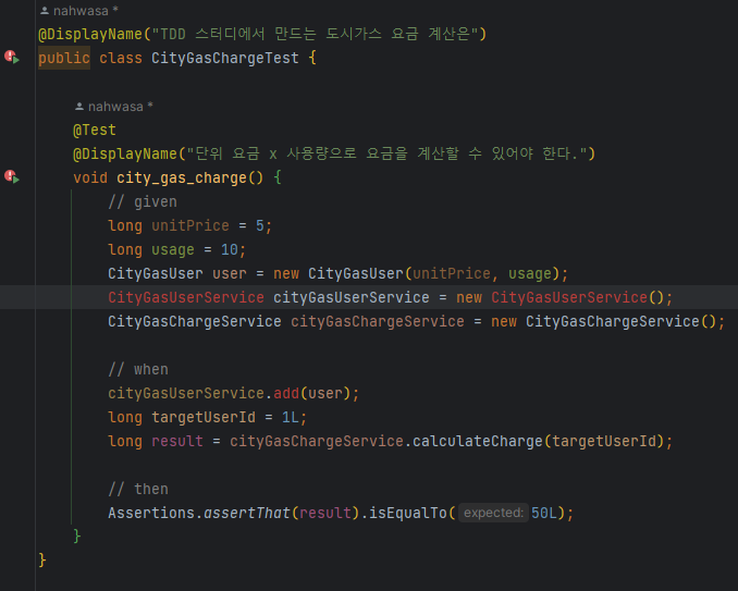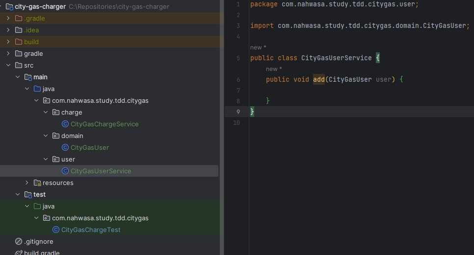 calculateCharge와 CityGasUser의 구현은 아래처럼 해줬다. 아직 CityGasUserService는 정의하지 않았다.