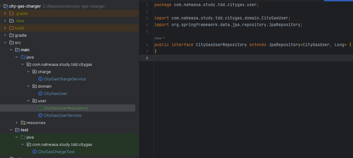 이제 CityGasUserService를 짜보려 했는데, 아직 정해지진 않았지만 차후 DB가 붙을것이다. 그럼 미리 그 부분도 생각해서 Repository 객체를 붙여두려고 한다. 차후 DB가 정해졌을 때 갈아끼우기 좋게 interface로 두고, JpaRepository를 사용해보기로 했다.