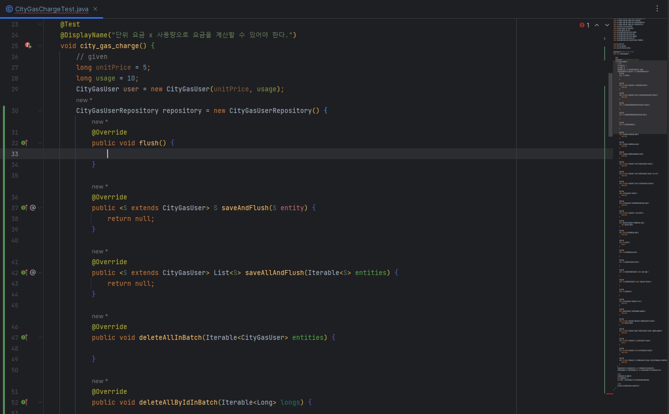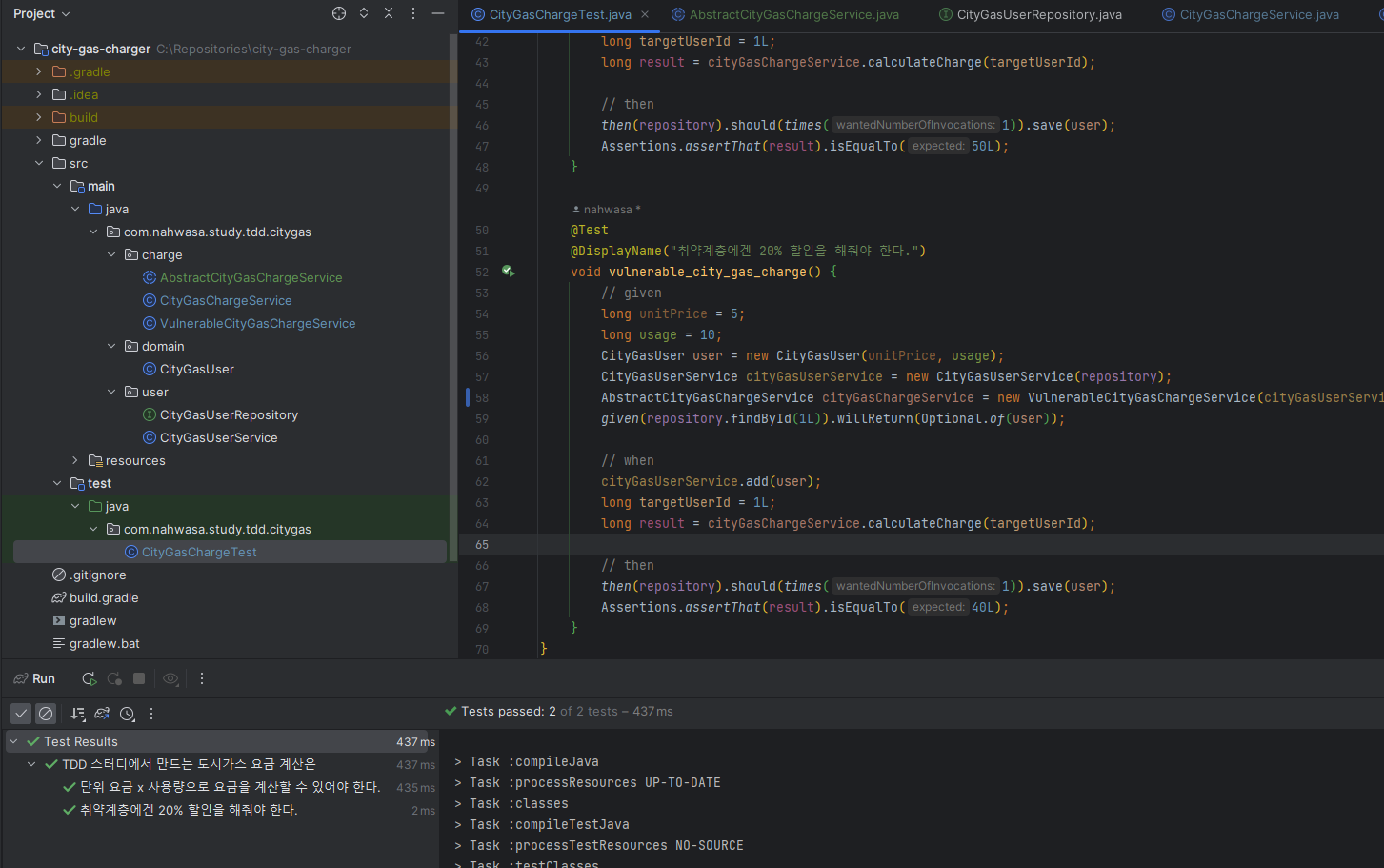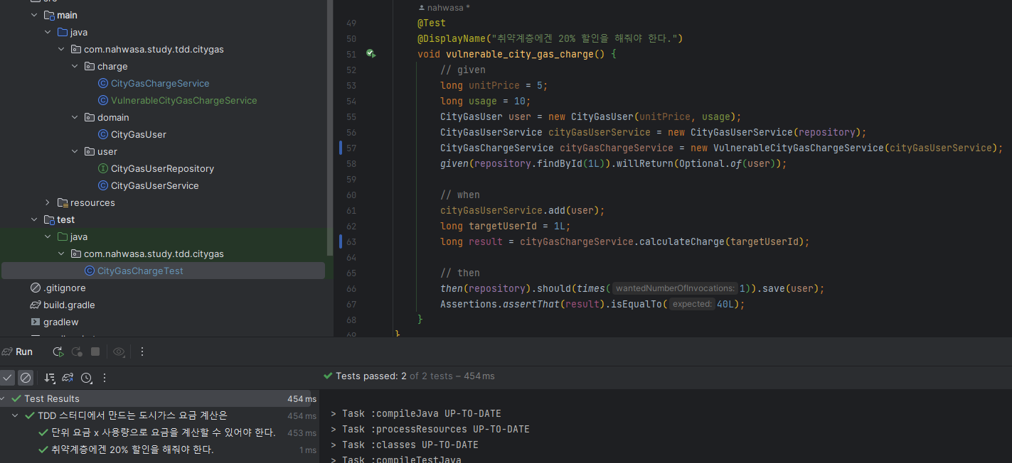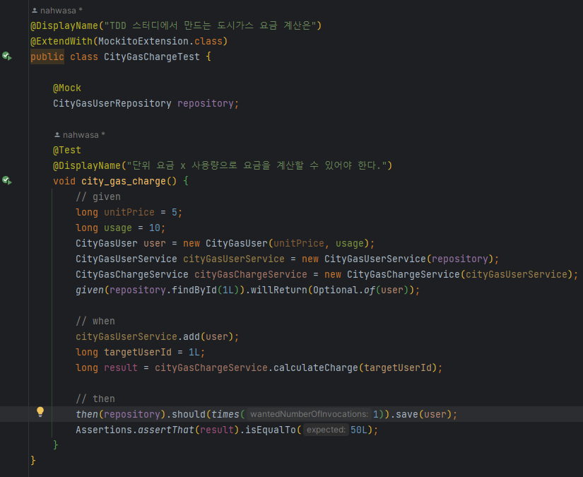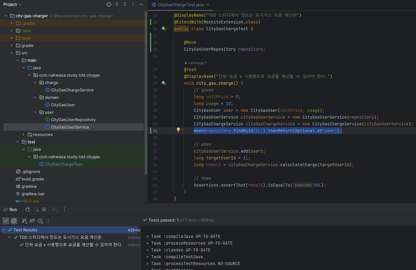 하지만 interface를 직접 구현해서 넣어줄때와 달리, Mockito에서 제공하는 함수들을 사용하면 편하게 원하는 동작을 만들어낼 수 있다. Mockito의 when()을 사용해 Mock 객체로 만든 repository에 findById가 인자 1L로 호출될 시, 테스트코드에 정의해둔 CityGasUser를 리턴하도록 했다. 이제 테스트는 통과한다!