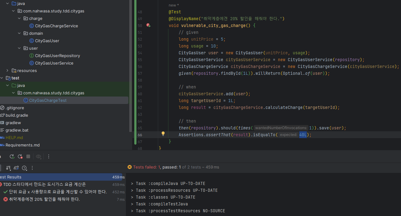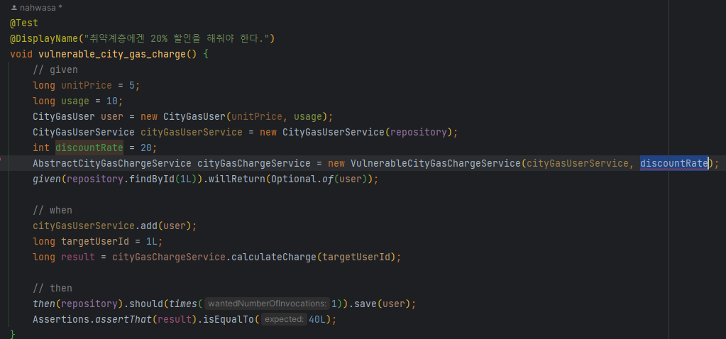 이제 요구사항에 있던대로 다른 요금 계산 방식을 추가해보자. 우선 취약계층에 20%할인(소수점 내림)을 해주는 요구사항을 추가할거다. 우선 테스트코드를 추가해준다. 20% 할인된 40L이 리턴되길 바랬는데, 당연하게도 테스트는 실패한다.