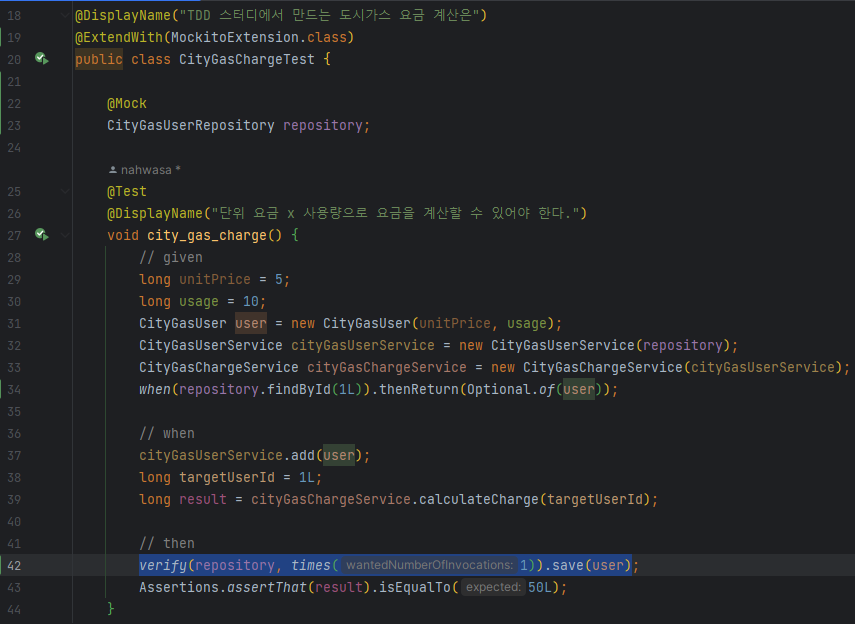 추가로 Mockito로 다양한 방식의 테스트가 가능한데, 어떠한 함수가 불렸는지도 확인 가능하다. findById로 유저 정보를 가져오려면 실제론 데이터가 DB에 들어가있었어야하는데, 우린 Mock 객체에 when()을 통해 해당 데이터를 리턴하도록 정의했으므로 실제 save()가 불리지 않았어도 리턴은 될 거다. 그럼 차후 DB를 실제로 구현했을 때 테스트가 문제가 될 수 있으므로 verify()를 통해 테스트 로직 중에 repository의 save()에 인자로 테스트코드에서 정의한 CityGasUser가 들어간게 1번 실행 됬는지 확인한다.