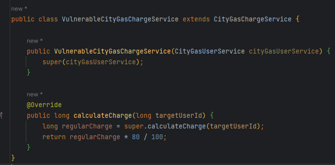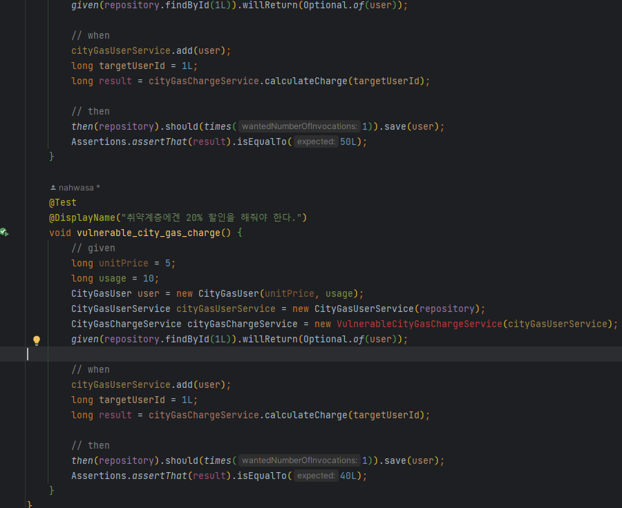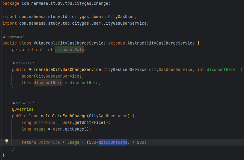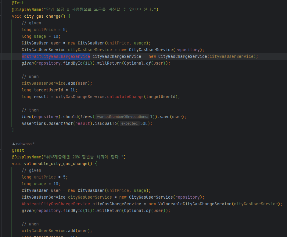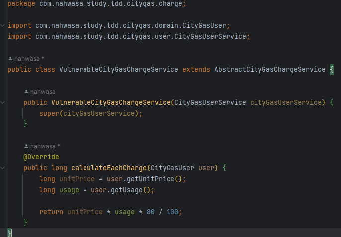 우선 상태값을 통해 분기치는 로직은 당연하게도 없애줘야 한다. 그리고 어차피 기본 요금 계산 로직에 비해 취약계층 계산 로직에 바뀐거라고는 20% 할인해주는 부분밖에 없다. 그럼 상속을 통해 기본 요금 계산 로직의 코드를 재사용(서브클래싱)해서 해결하면 된다고 생각해볼 수 있다. 우선 테스트코드는 상태값을 넣기 전으로 돌리고, 취약계층은 기본 요금 계산 로직을 재사용한 새로운 클래스로 만들테니 테스트코드에 반영한다. 그리고 CityGasChargeType은 이제 안쓸거니 지워줬다. 기본 요금 계산 로직도 원래대로 돌려준다.