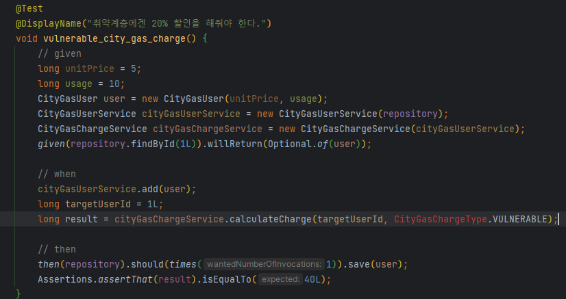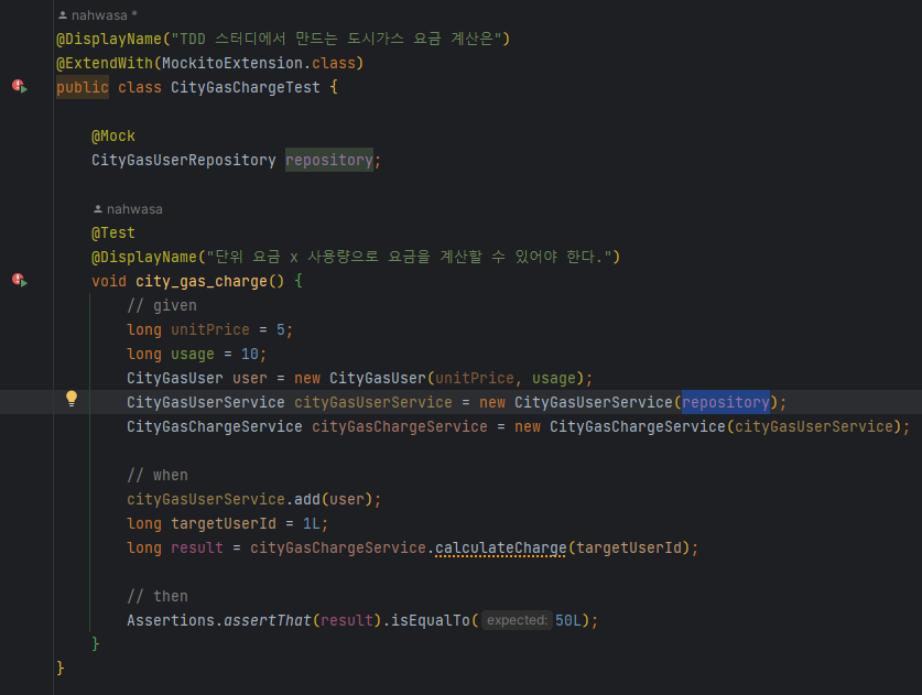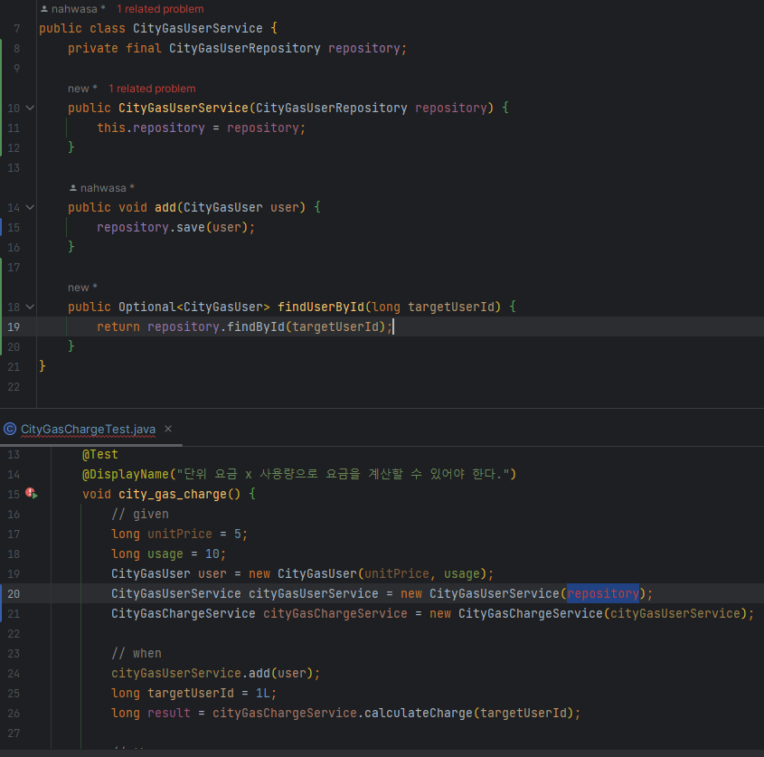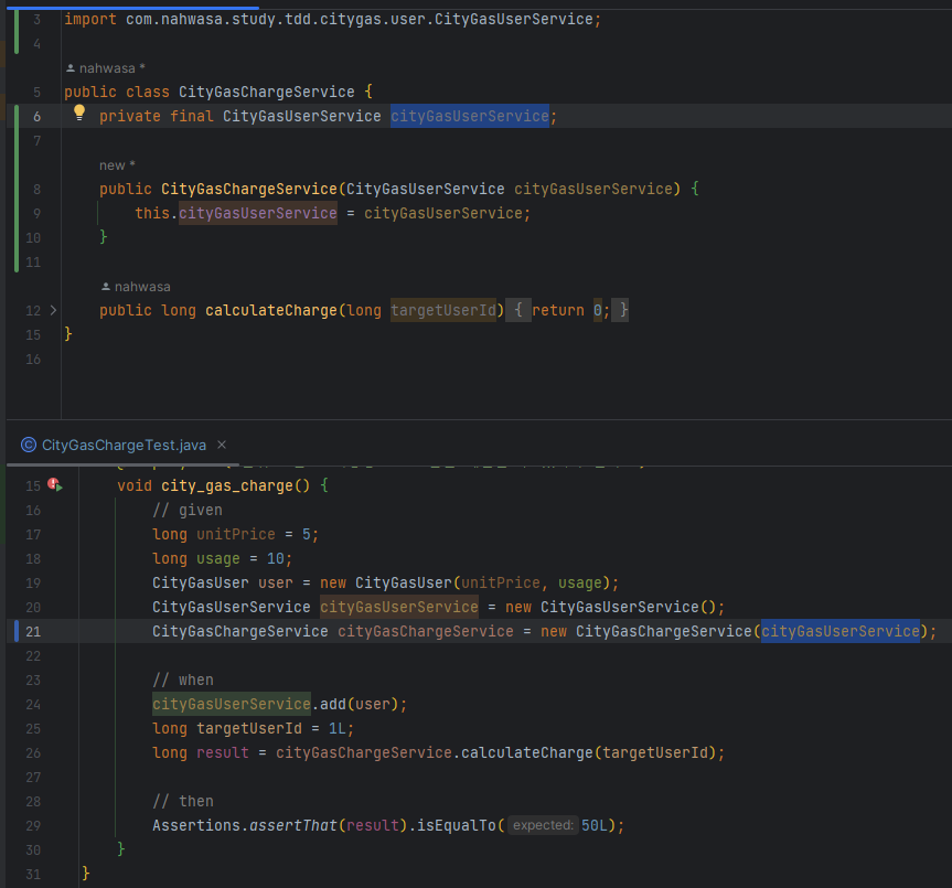 calculateCharge에서 targetUserId를 기준으로 유저 데이터를 가져오려면 CityGasUserService를 가지고 있어야 할 것 같다. 일단은 생성자에서 주입받기로 한다. 이에 따라 테스트 코드도 수정되었다.