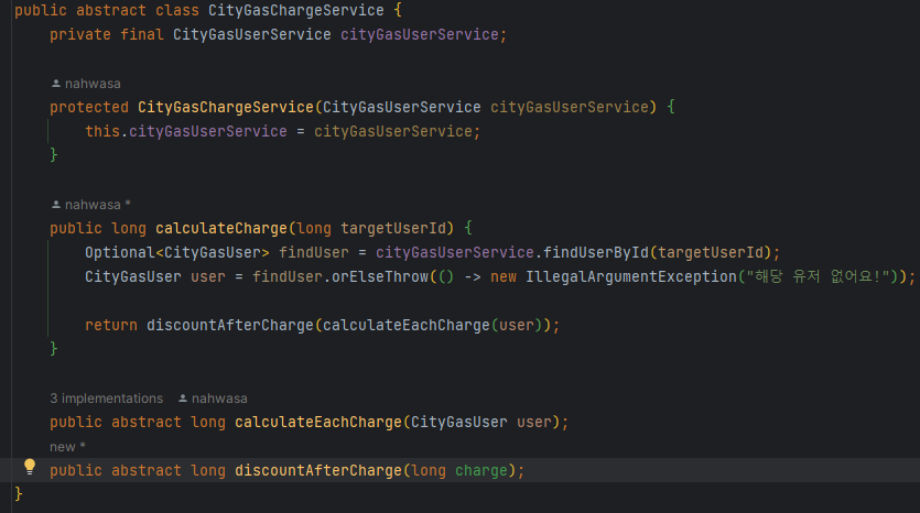 AbstractCityGasChargeService를 상속받아 기존 두 계산 로직을 변경하면 다음과 같다.