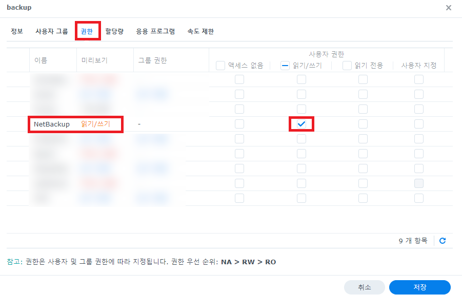 그리고 해당 계정의 '권한'에서 'NetBackup'에 '읽기/쓰기'권한을 줘야 한다.