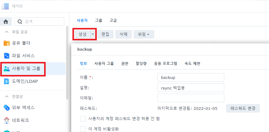 기존 유저로 해도 되겠지만, 아무래도 백업용으로 별도 계정을 쓰는 것이 보안이나 관리 측면에서 더 좋을 것이다. '제어판 -> 사용자 및 그룹 -> 생성 -> 백업용 계정 생성'