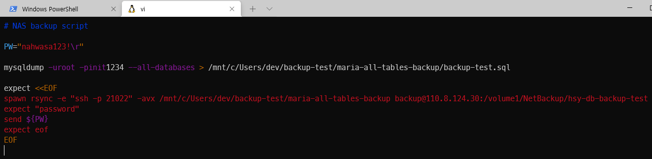 예를들어 다음은 내가 작성한 테스트 스크립트이다. 마리아 DB를 백업한 후 NAS로 rsync를 통해 백업하는 스크립트이다.