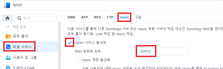 NAS 관리자 권한 계정으로 접속 후 '제어판 -> 파일 서비스 -> rsync -> rsync 서비스 활성화 및 포트 작성'